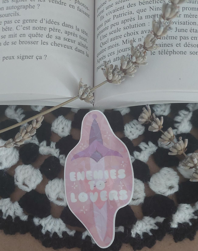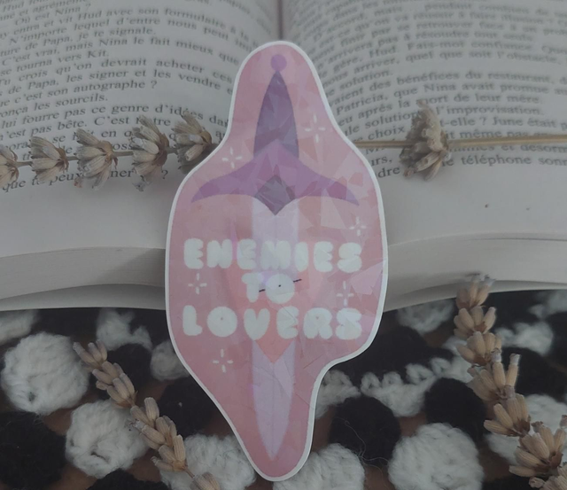 L'autocollant représente un coeur transpercer d'une épée, qui illustre la trope "enemies to lovers"