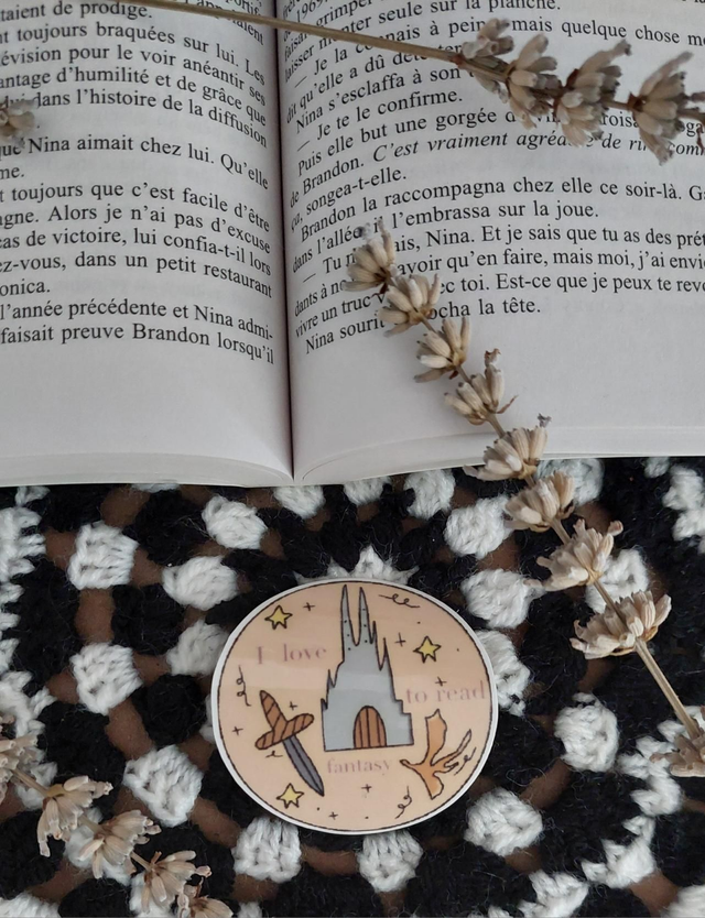 L'autocollant représente une inscription qui dit " j'aime lire de la fantaisie". Parfait pour les fan de fantaisie et de lecture.