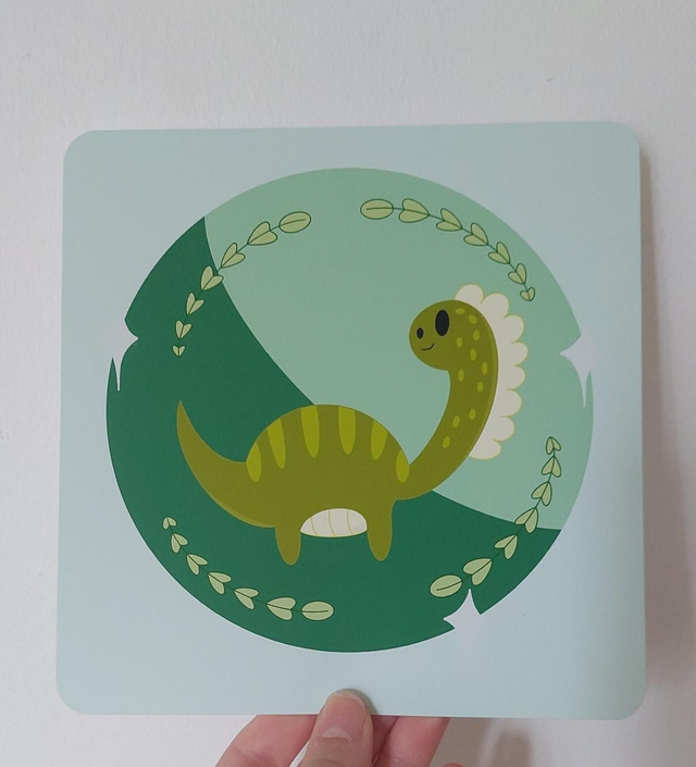 Illustration format carré d'un petit dinausaure mignon. Imprimer sur du papier photo mat 200gr. Parfait pour décorer une chambre ou un bureau, est le rendre cosy.