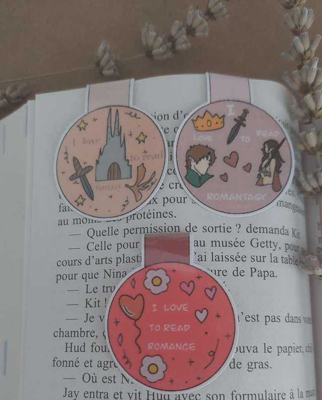 Marque-pages magnétique réalisé par mes soins. 3 choix s'offre a vous. Marque-pages magnétique fantasy, romance ou romantasy. Dimension: 4.5x3.7 cm